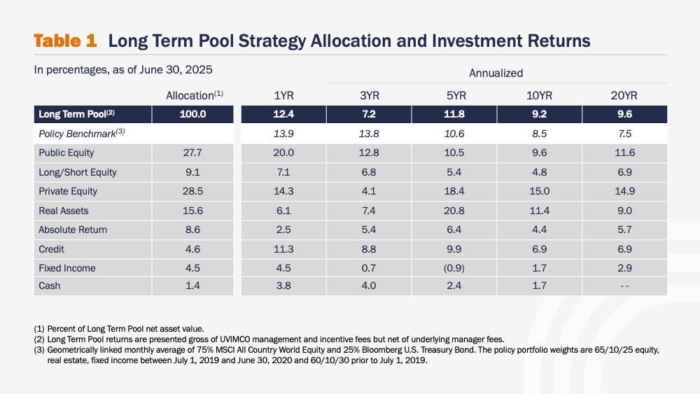 UVIMCO provides investment management services to the University of Virginia and associated organizations to serve the University’s mission. UVIMCO’s primary objective is to maximize the long-term, inflation-adjusted returns commensurate with the risk level of the University. Its secondary objective is to secure higher returns than the passive policy portfolio, which provides asset allocation guidelines for the Long Term Pool.